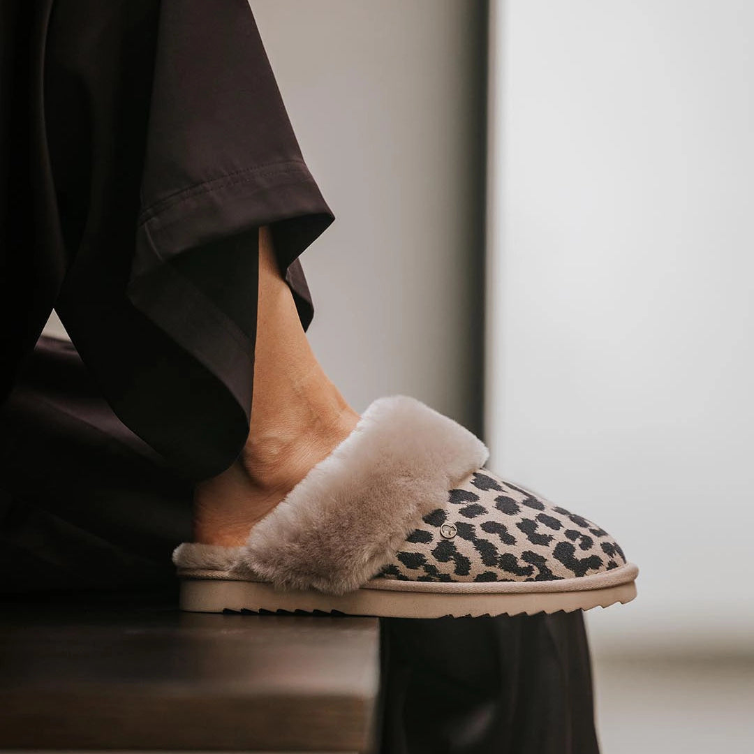 Are you looking for original and unique women's slippers? Then you've found the perfect pair with these Warmbat Collie Print slippers. These slippers feature a unique leopard print. These relaxed slip-ons also have a wonderfully soft lining. This way, you can walk around comfortably at home, and in style! Warmbat slippers are known for their wonderfully fine Merino sheep wool core. And for good reason. The sheep wool is soft, springy, and naturally thermostatic. This means your feet are never too hot or too cold, but perfectly at the right temperature. Moreover, the quality of the wool ensures dry feet, regardless of the ambient temperature. These comfortable home shoes are also covered with a leather exterior and have a non-slip sole made of EVA (ethylene vinyl acetate) and rubber.